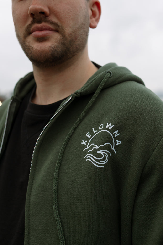 This army green zip-up hoodie is a must-have for showcasing your love for Kelowna's outdoorsy lifestyle, from mountainside trails to lakeside views. Featuring the 'Kelowna Mountain Wave' design on the left chest, it's an easy, versatile layer for relaxed summer nights.