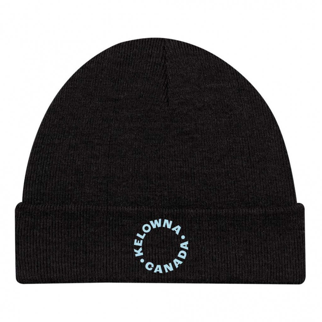 On cold Okanagan days, stay warm with this black rib knit toque. Featuring the 'Kelowna Canada' logo in blue embroidery and a cuff design, this is the perfect winter staple.