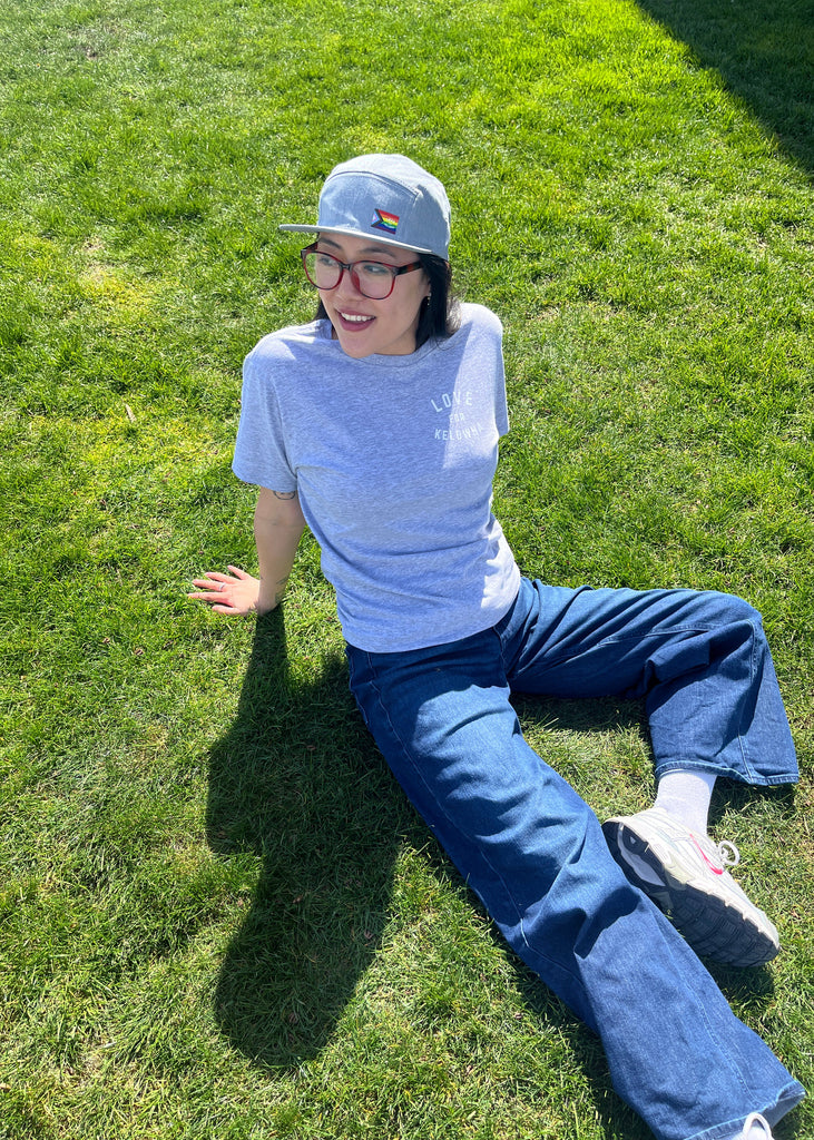 Pop on our five-panel camper-style hat for your next Okanagan Lake day. Featuring our 'Love for Kelowna' logo printed inside a pride flag in the bottom left corner and an adjustable nylon woven backstrap, this unique jockey hat is the perfect accessory for your next hike or day at the beach.