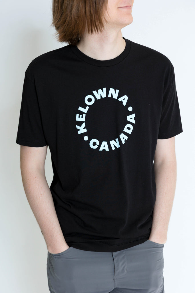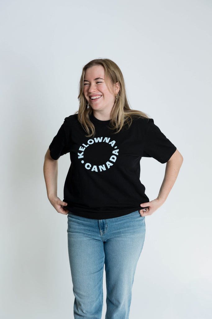 Throw on our black-and-blue t-shirt, the perfect base for a day at the farmers’ market, on the lake, or nights downtown. Featuring a circular ‘Kelowna Canada’ logo in baby blue and hemmed sleeves, this unisex t-shirt is a versatile, comfortable staple for any summer wardrobe.