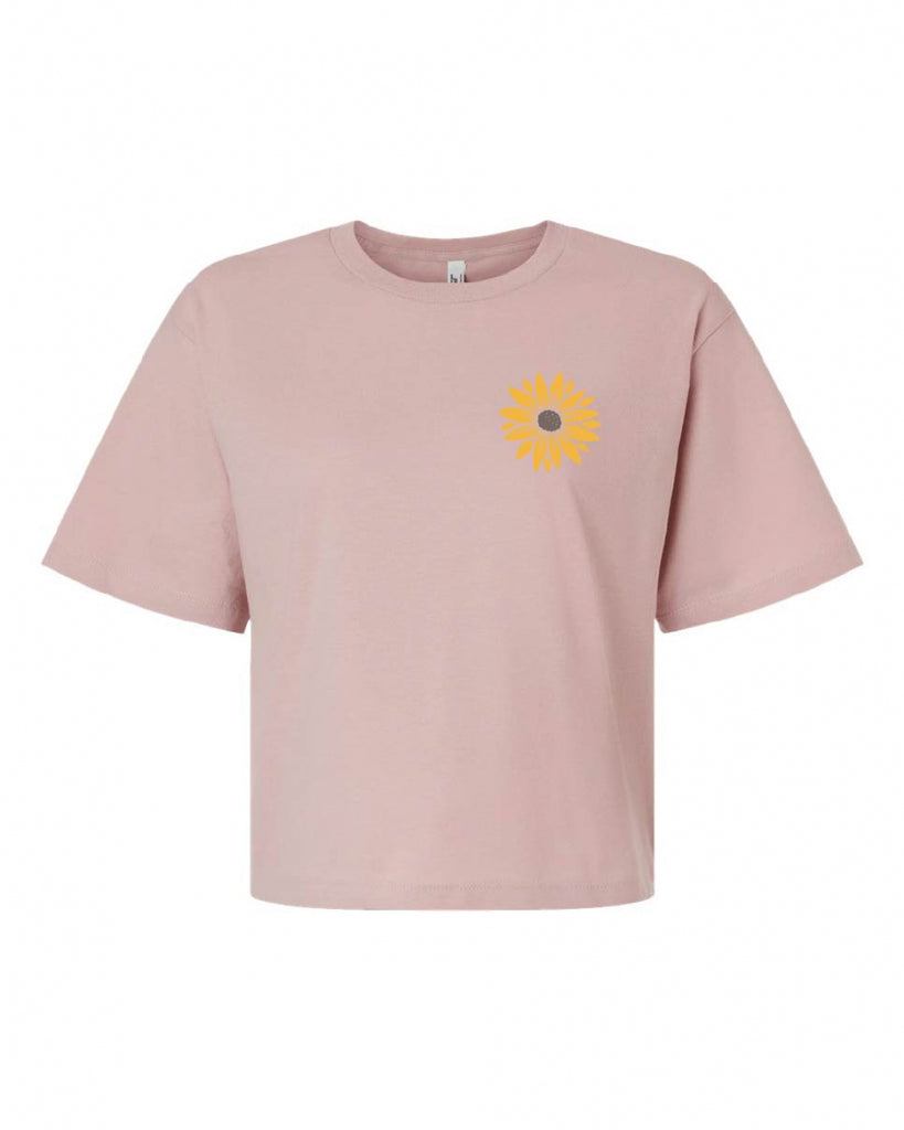 An ode to Kelowna's special flower, the arrowleaf balsamroot, this blush pink t-shirt is built for spring. It features a bold, enlarged arrowleaf design on the back and a single flower on the front left chest. With a mid-length, cropped fit, this soft t-shirt is the perfect way to make a statement this spring and show your love for Kelowna.