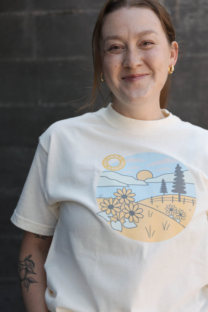 Created in collaboration with local artist Ashleigh Green, this limited-edition tee celebrates Kelowna hosting the 2025 Canadian Country Music Association Awards. On a soft cream base, it features a circular center print by Ashleigh of the arrowleaf balsamroot overlooking Okanagan Lake, with a smaller ‘Kelowna Canada’ logo at the top left. A perfect mix of local pride and wearable art.