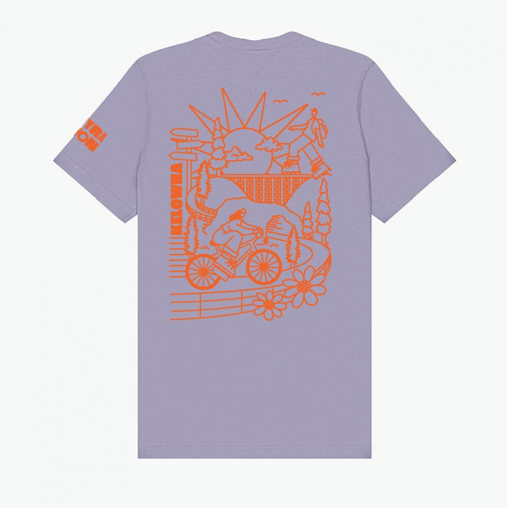 Made in celebration of the iconic Myra Canyon Trestles attraction, this soft, dark lavender t-shirt is the perfect statement piece for your wardrobe. It features a bright orange illustration on the back, created by a local artist, depicting the local trestle park. The left sleeve is accented with 'Myra Canyon,' making this the perfect memento of your visit to the attraction.