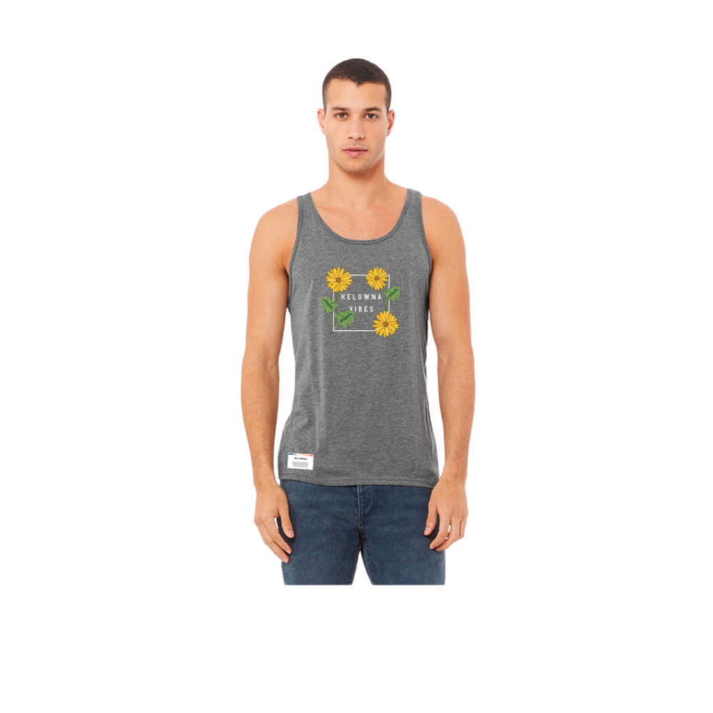 Our grey sunny Okanagan flower tank channels the laid-back spirit of Kelowna, where lake life meets mountain trail views. This ultra-soft, breezy triblend tank, featuring the the iconic ‘Kelowna Vibes’ logo framed by the arrowleaf balsamroot, is the perfect mix of Kelowna pride and wearable art.