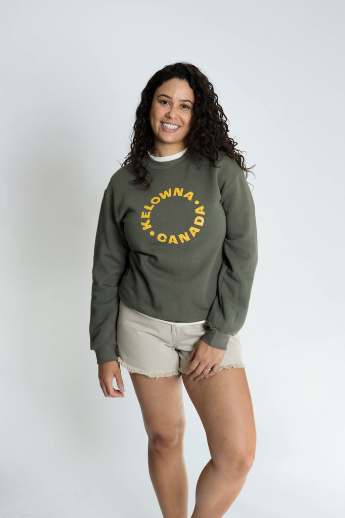 Pair this army green crew with your next mountain adventure as the perfect cozy layer. Featuring an enlarged circular ‘Kelowna Canada’ logo in gold, this unisex crew combines a relaxed drop-shoulder fit with soft, durable fabric, making it an easy go-to for every Okanagan season.