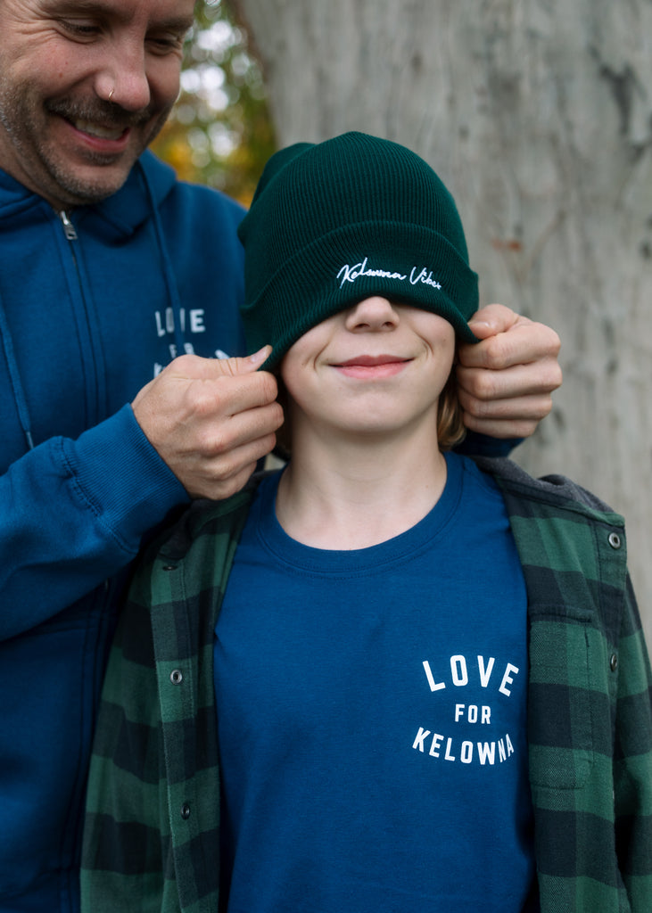 Throw on our soft navy-blue tee—the perfect back-to-school essential. Featuring our classic ‘Love for Kelowna’ logo in white, this unisex tee is a versatile, comfy staple for any Okanagan season. Teagan (age 12) is wearing a size small.