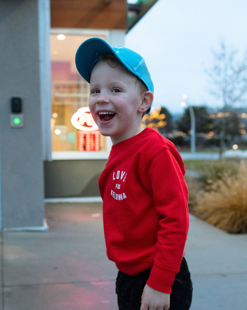 Our bright fire-truck-red crew adds a bold pop of colour to your toddler's wardrobe. With the iconic ‘Love for Kelowna’ logo in white, this cozy layer is made for all Okanagan seasons.