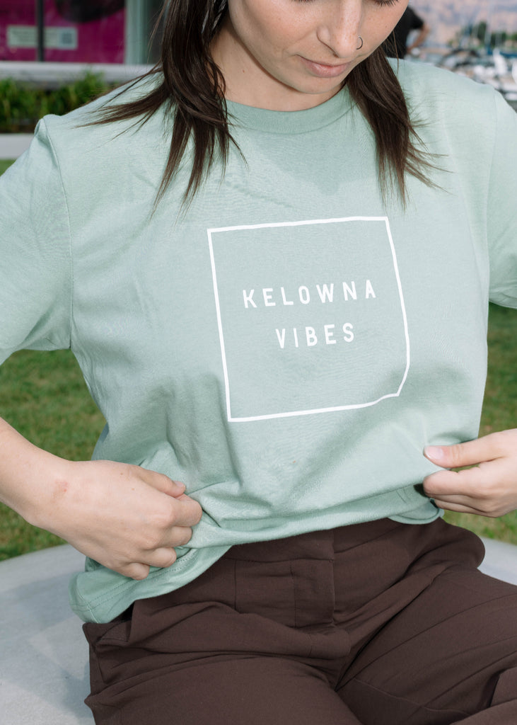 Our soft sage tee channels the laid-back spirit of Kelowna, where lake life meets mountain views. With hemmed sleeves and the iconic ‘Kelowna Vibes’ logo framed in a sleek white box, it’s made for the stylish minimalist who values comfort on lake days.