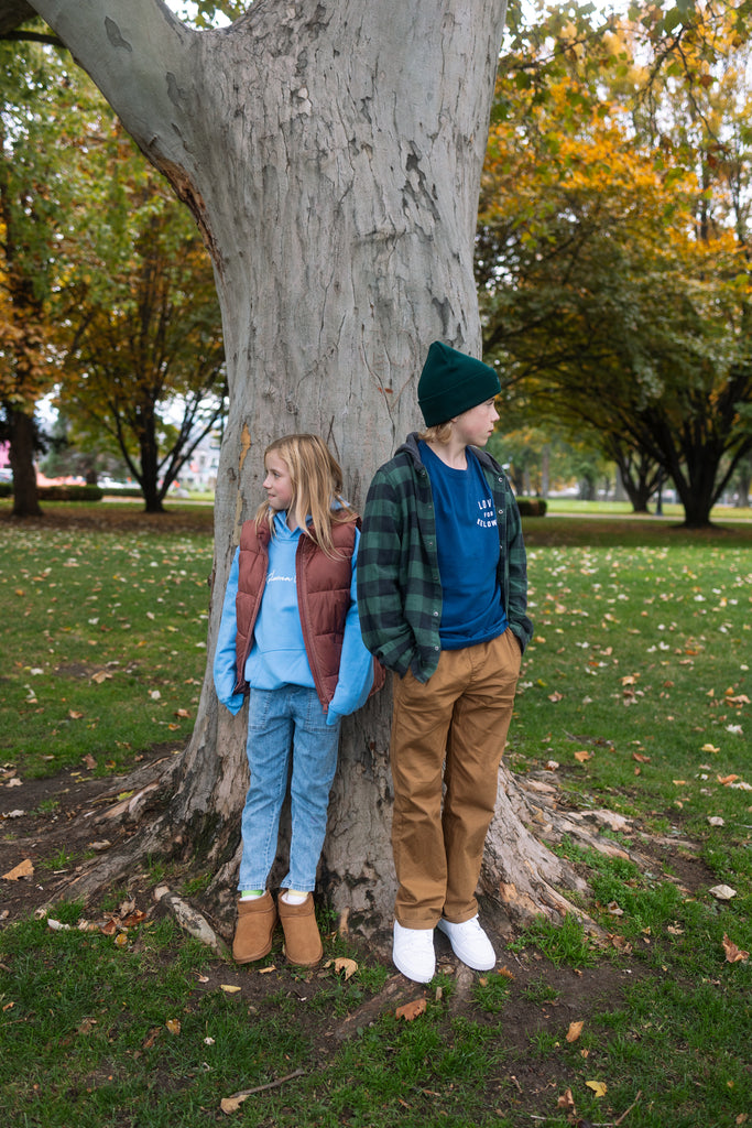 Throw on our comfy sky-blue hoodie—the perfect fall essential. Featuring our cursive ‘Kelowna Vibes’ logo in white, this unisex hoodie is a versatile, comfy staple for any Okanagan season. Autumn (age 10) is wearing a youth large.
