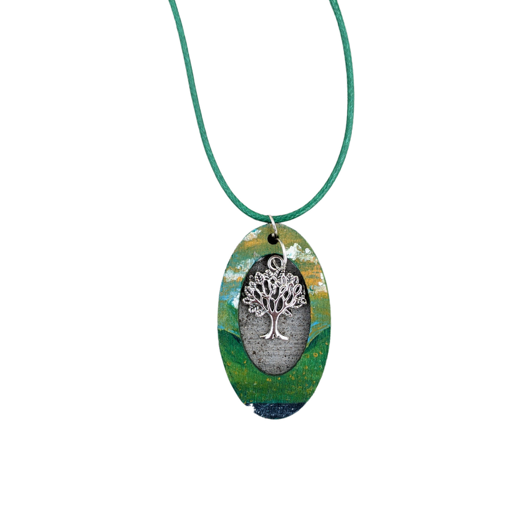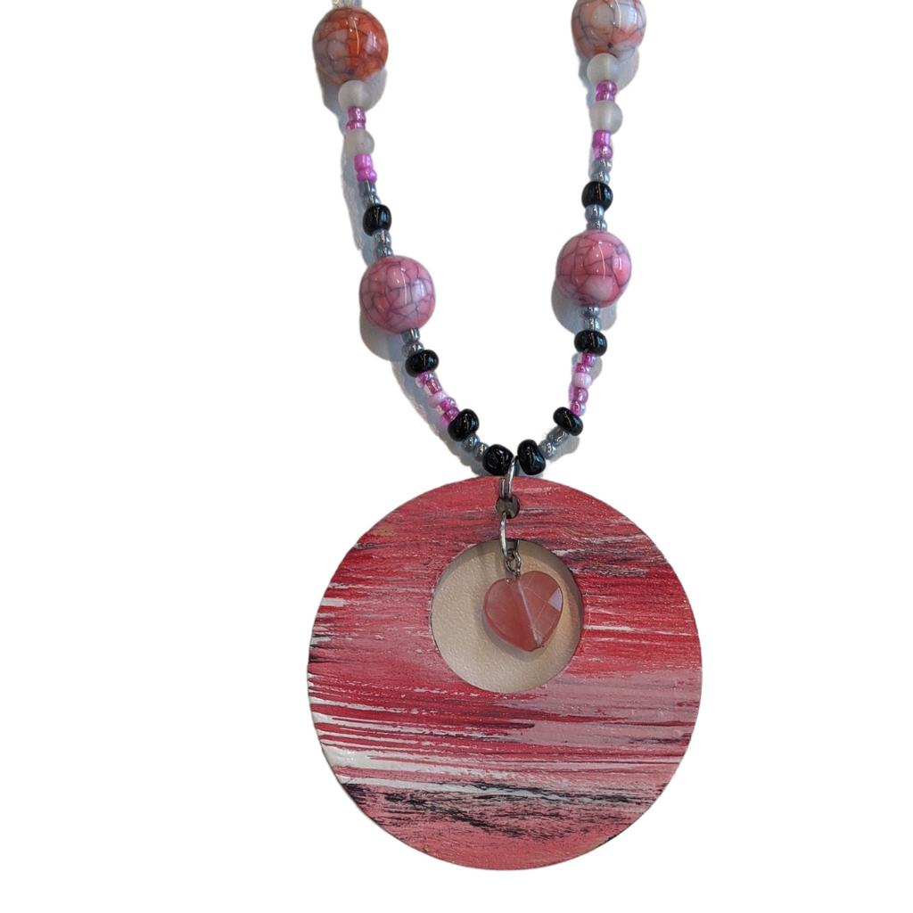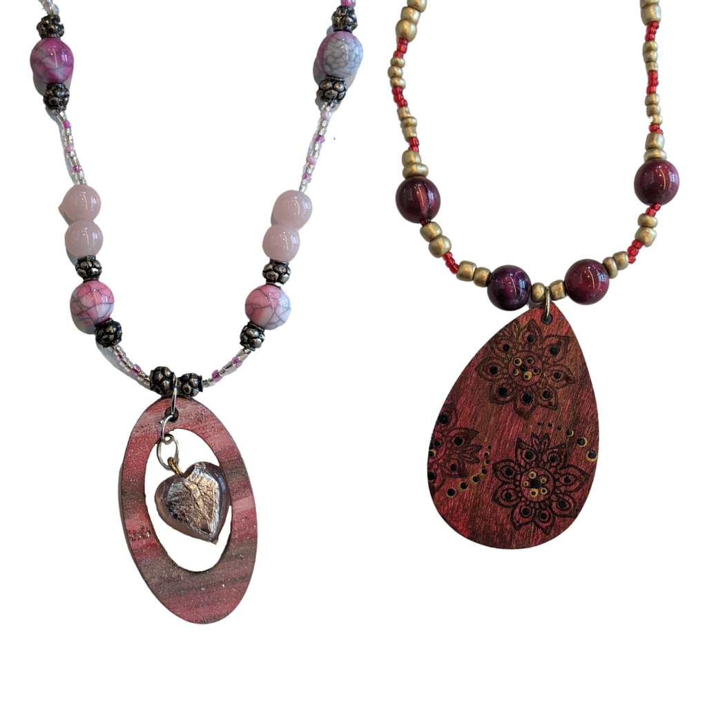Locally made handpainted wooden necklace charms. All beaded options are hand-beaded using beads recycled from old jewelry.