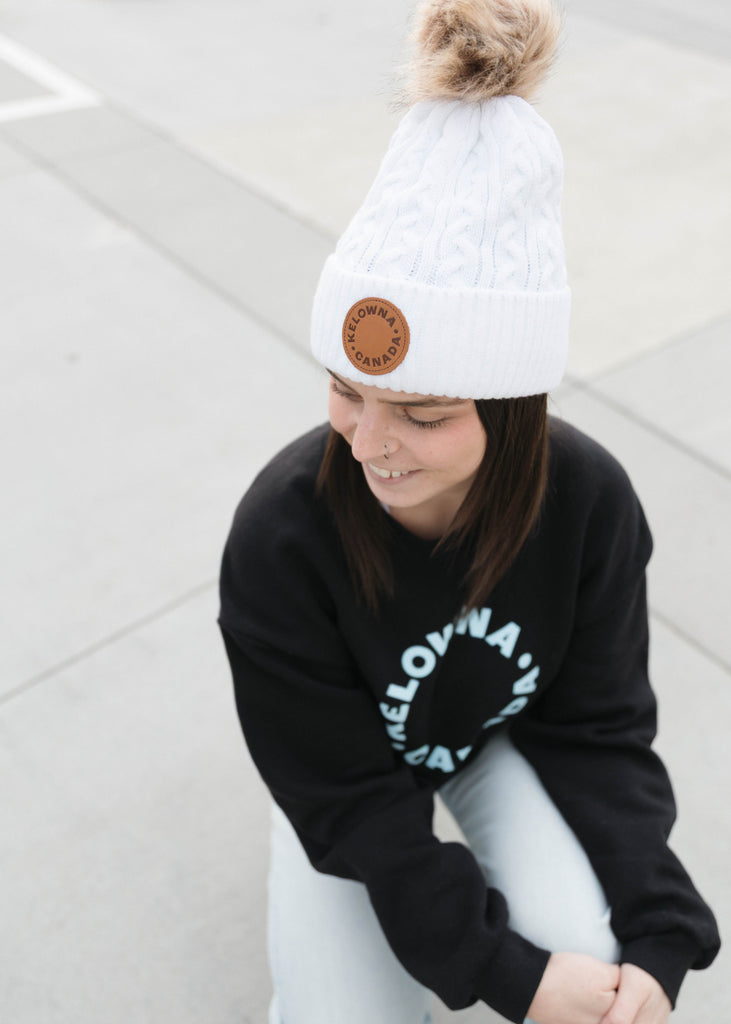 On cold Okanagan days, stay warm with this soft cream jacquard cable knit toque. Featuring a cozy pom pom and 'Kelowna Canada' brown leather patch, this is the perfect winter accessory.